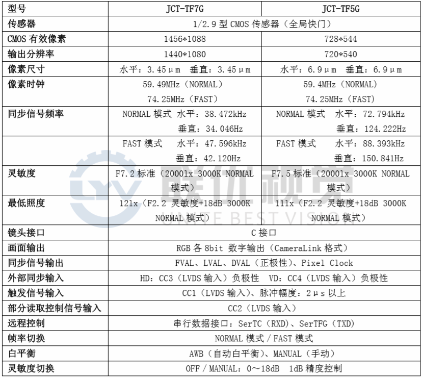 產(chǎn)品簡介●高像素型:JCT-TF7G(1440*1080、42 幀)●搭載 1/2.9”逐行掃描 3CMOS 傳感器 ?●CameraLink/PoCL 模式 ●外部觸發(fā)功能(單次脈沖觸發(fā)、寬幅脈沖觸發(fā)) ●部分讀取功能(TF5G:1 個位置、TF7G:4 個位置)●抖動修正功能 ●自動快門功能
