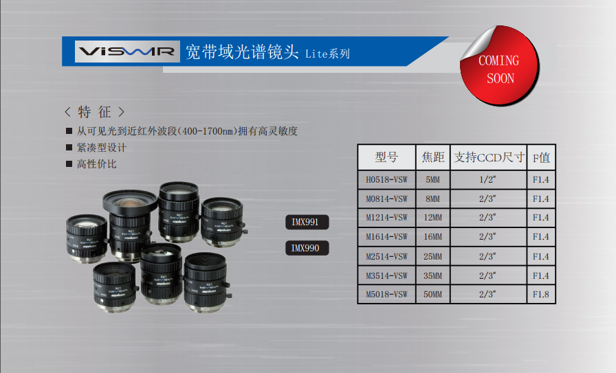 ViSWIR 鏡頭系列使用最新的可見光(Visible) +短波紅外(SWIR)傳感器提供高質(zhì)量的圖像。這款高性能鏡頭專為非可見光范圍成像而設(shè)計,可將多種應(yīng)用應(yīng)用于多個市場,包括半導(dǎo)體、農(nóng)業(yè)、醫(yī)療、遙感等。