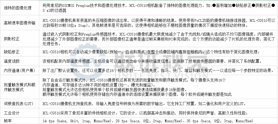 ●XCL-CG510(黑白)結合了最好的索尼技術在一個方便的立方形式的因素,這是最佳的使用在工業(yè)視覺和非制造的視覺市場。