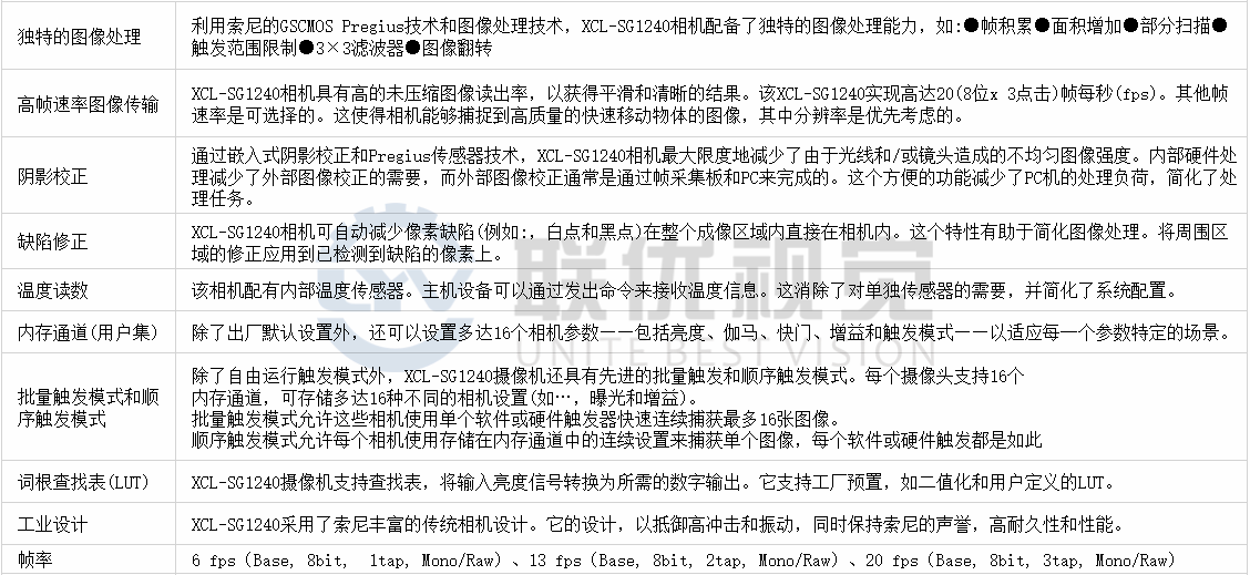 ●該XCL-SG1240(黑白)結(jié)合了索尼技術的最佳在一個方便的形式因素,這是優(yōu)化的工業(yè)視覺和非制造的視覺市場使用。