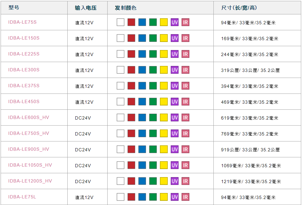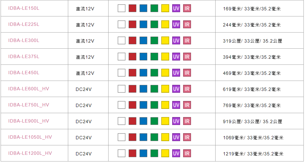 發(fā)出的顏色是白色,紅色,藍(lán)色,綠色,黃色,紅外線和紫外線,照射類型為可以照射高范圍的“ S型”和可以遠(yuǎn)距離照射的“ L型”。