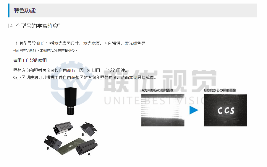 141種型號*的組合包括發(fā)光表面尺寸,發(fā)光寬度,方向特性,發(fā)光顏色等。*標準產(chǎn)品總數(shù)(常規(guī)產(chǎn)品和高產(chǎn)量類型)適用于廣泛的應用照射方向和照射角度可以自由調節(jié),因此可以用于廣泛的用途。條形照明使您可以根據(jù)工件自由調整照射方向和照射角度,從而實現(xiàn)最佳成像。