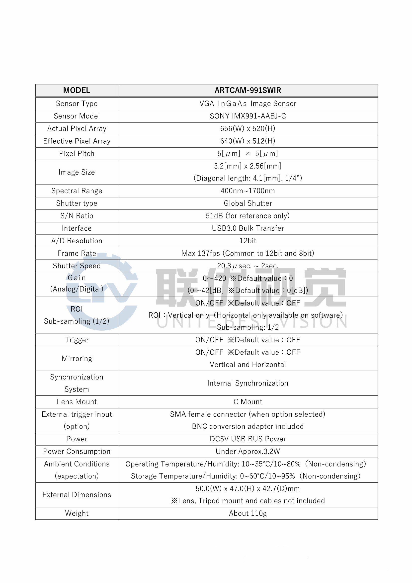 ARTRAY 400-1700nm寬波段近紅外相機--ARTCAM-991SWIR
